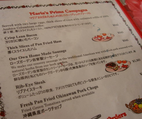 メニュー表にはマリアおばあちゃんのカントリーブレックファーストと書かれてある。ボリュームたっぷりの朝食で、アメリカではとてもポピュラーな朝食メニューとのこと。