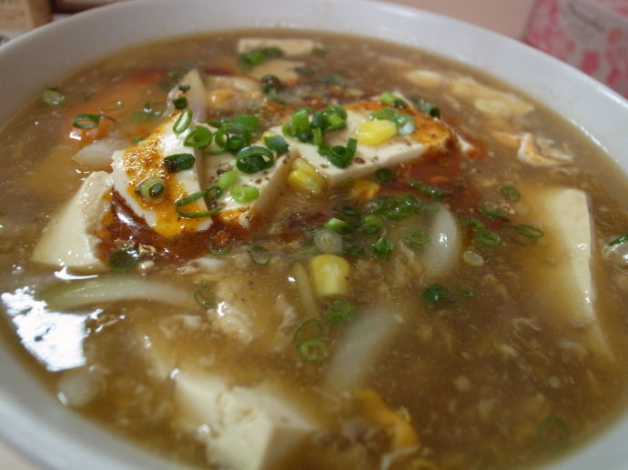 豆腐がたっぷり添えられ、ぽてんとした汁に半熟状の卵や野菜が合わさる。