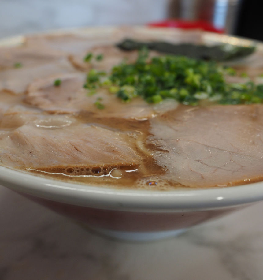 敷き詰められたチャーシューから覗くスープの表情は妖しく、良い感じ。