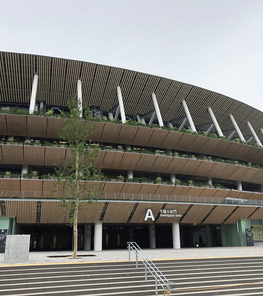 暖かい木材の色が印象的な新国立競技場。