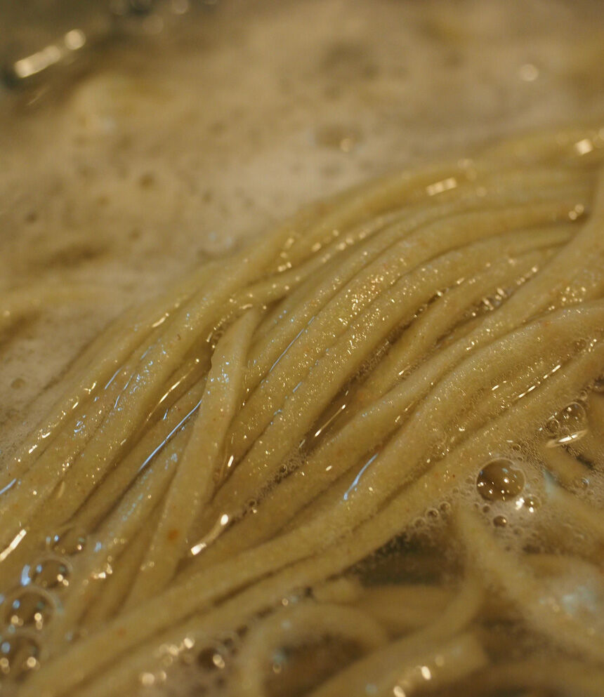 湯を泳ぐ蕎麦は緑発色していて非常に美しい表情。